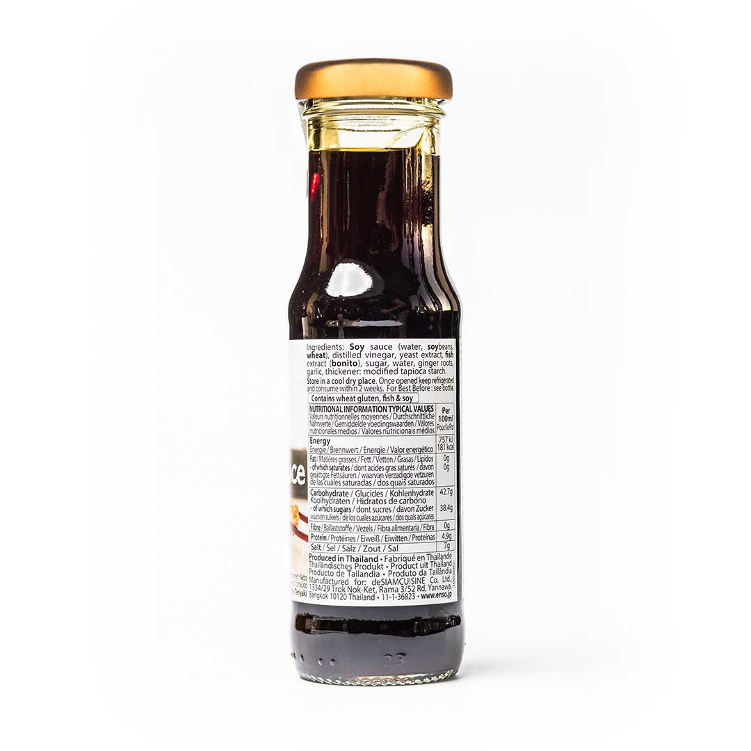 المكونات: صلصة الصويا (الماء ، فول الصويا ، دقيق القمح ، الملح ، السكر) ، الخل المقطر (الماء ، منظم الحموضة: حمض الخليك) ، مستخلص الخميرة ، مستخلص السمك (بونيتو) ، السكر ، الماء ، جذور الزنجبيل ، الثوم ، مثخن: نشا التابيوكا المعدل.